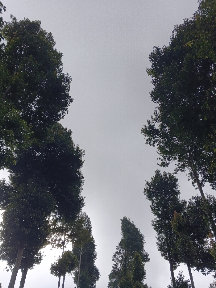 The image displays an upward-facing view of an overcast sky framed by numerous tall trees. The sky, a uniform light grey, dominates the central and upper portions of the frame, indicative of dense cloud cover. Dark green foliage from multiple trees extends into the frame from the left, right, and bottom. The trees feature visible, slender trunks and dense canopies of broad, dark green leaves. Diffused sunlight is present, illuminating some leaf clusters from behind, particularly in the lower left and central sections. No people, objects, actions, or interactions are visible. The scene is consistent with an outdoor natural environment located in the city of Pinnwe, Myanmar (Burma).