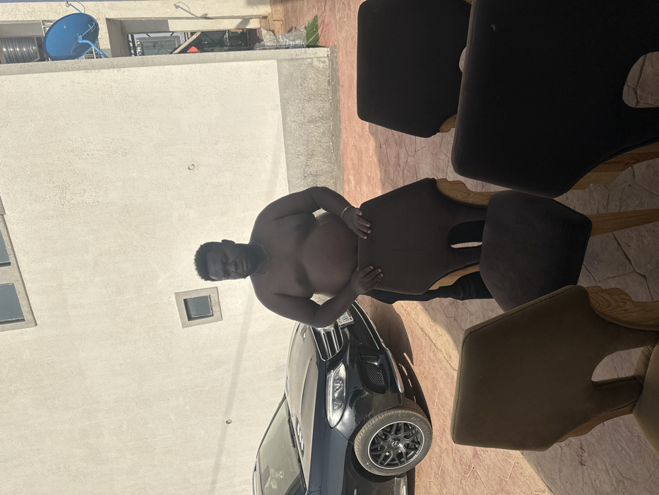 A shirtless man with dark skin stands between a black car and several chairs. He wears a gold necklace and bracelet. The car's front is visible, including a tire with a Mercedes logo. A building with windows and a satellite dish is in the background. The chairs are a mix of brown and black, arranged around the man. The ground has a textured, stone-like pattern.