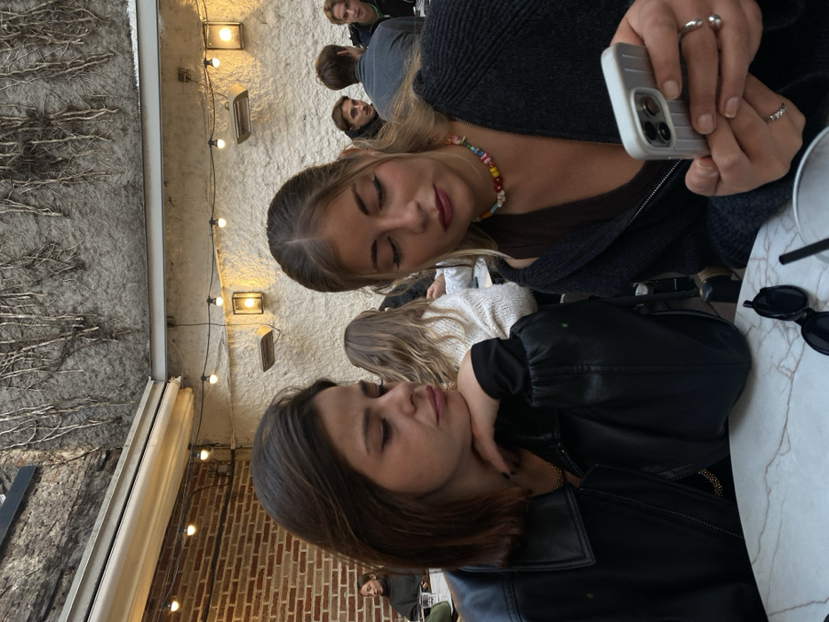The image displays two young adult females seated at a white marble-patterned table within an establishment