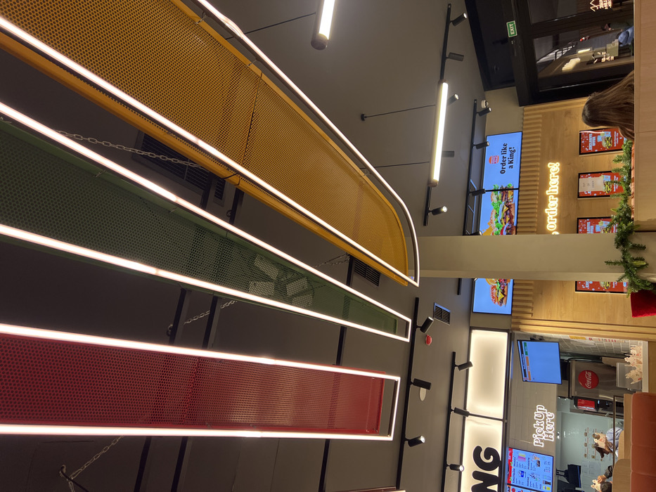 interior of a Burger King restaurant with modern design elements. Perforated panels colored red, green, and yellow, illuminated by bright white lights, hang from the ceiling. The back wall features menu boards with food images and order prompts, alongside a pick-up area with digital displays. A Coca-Cola refrigerator is visible, and text on the wall reads "KING" and "Pick Up Here". The overall ambiance is bright and contemporary.