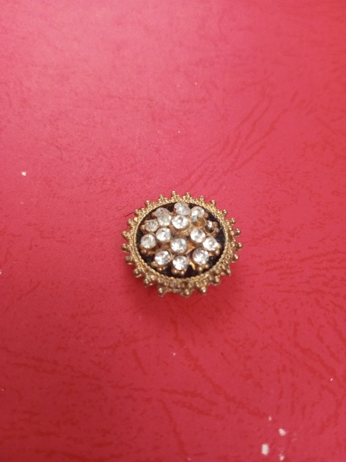 An oval-shaped brooch sits on a red surface. The brooch has a gold-colored, ornate rim. Its center is black with numerous clear, sparkling stones arranged in a cluster. The piece appears vintage or antique, possibly a costume jewelry item. The stones are small and round, giving the brooch a textured, sparkling appearance.