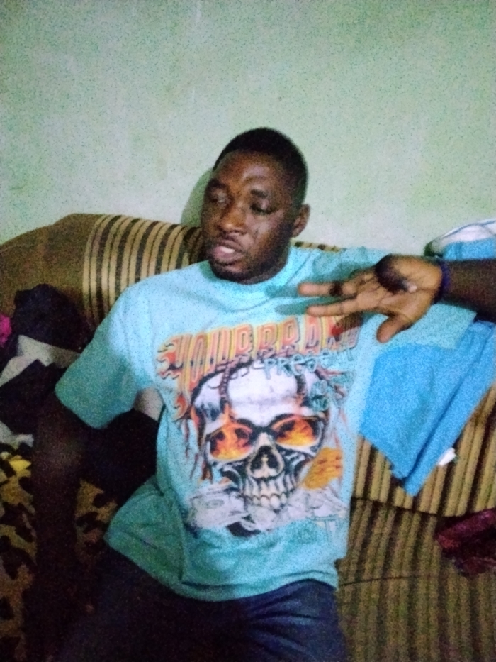 The image displays an adult male seated on a striped couch indoors in Gama, Nigeria