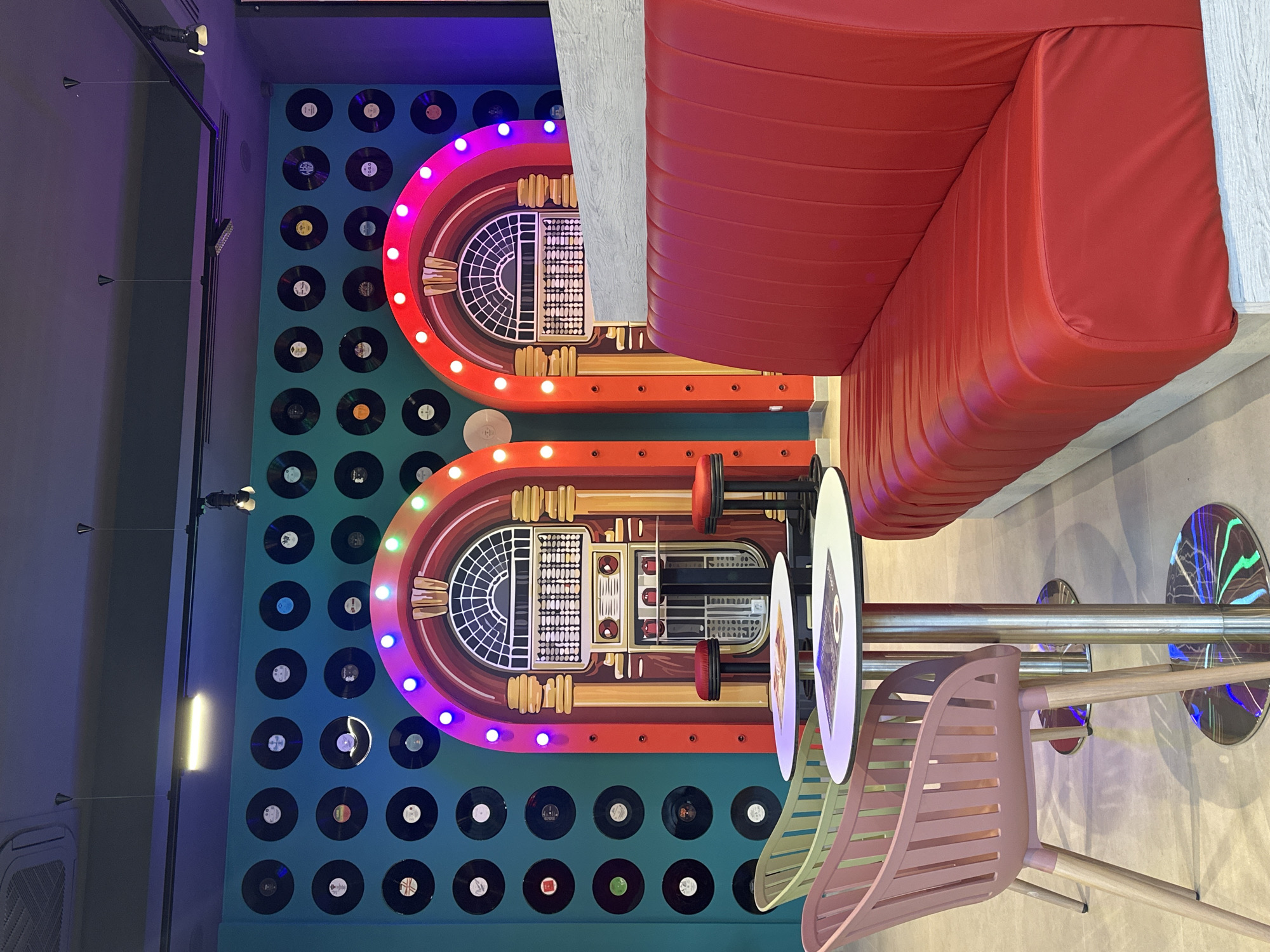The image depicts an interior space, likely a diner or restaurant, in an undetermined location, which is not Kovačko Polje, Montenegro based on the available details in the scene. The focal point is a wall decorated with two large, illuminated jukebox replicas, set against a teal-colored background adorned with numerous vinyl record decorations. A red, padded booth-style seating is positioned on the right side of the frame, suggesting a classic diner setting. A light pink, modern-style chair is visible in front of a table with a silver pedestal. The setting is brightly lit with modern light fixtures, adding to the lively and retro ambiance. The scene lacks any people or explicit actions.
