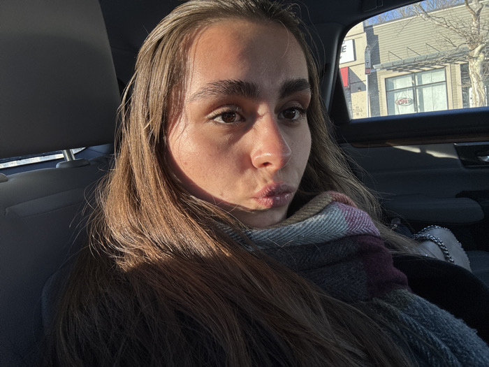 - "A woman sits in a car wearing a scarf and looking at the camera with slightly pursed lips" by FM-tmcYE2, licensed under CC BY 4.0