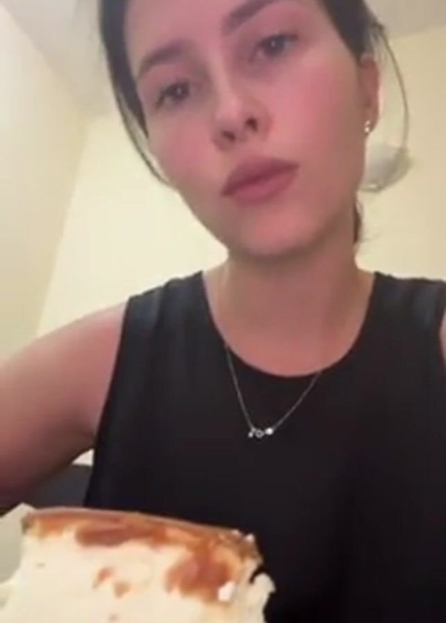 A woman is filmed from a close angle. She is eating a square of layered cake from a plate with a fork. Her hair is pulled back, and she is wearing a black sleeveless top and a silver necklace. She has a serious or neutral expression. The background shows a plain wall and a glimpse of a light fixture.