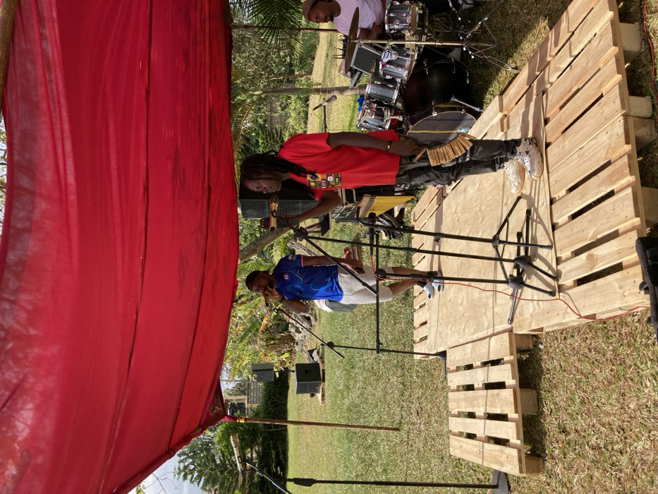 An outdoor musical performance is depicted in Murera ward, Kenya, occurring under a large, bright red fabric canopy