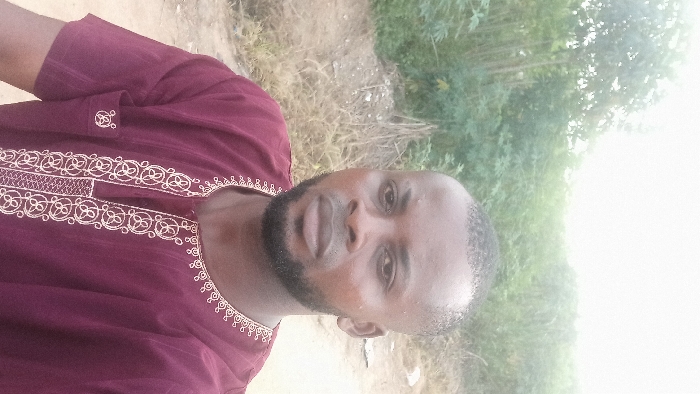 A man faces forward, wearing a maroon shirt adorned with white embroidery around the neckline. He has a dark beard and short, dark hair. The background is a mix of greenery, including trees and grass. A patch of bare ground is visible to the side. The lighting is bright, causing some glare in the background.