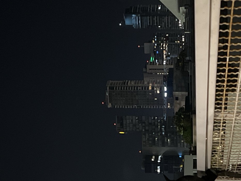 A nighttime view from a high vantage point showcases a cityscape. Several high-rise buildings with illuminated windows punctuate the dark sky. The buildings appear to be in varying states of construction or completion. In the foreground, a grated metal structure is visible, suggesting the image was taken from a balcony or similar elevated platform. The night sky is dark, providing a backdrop that accentuates the lights emanating from the city.