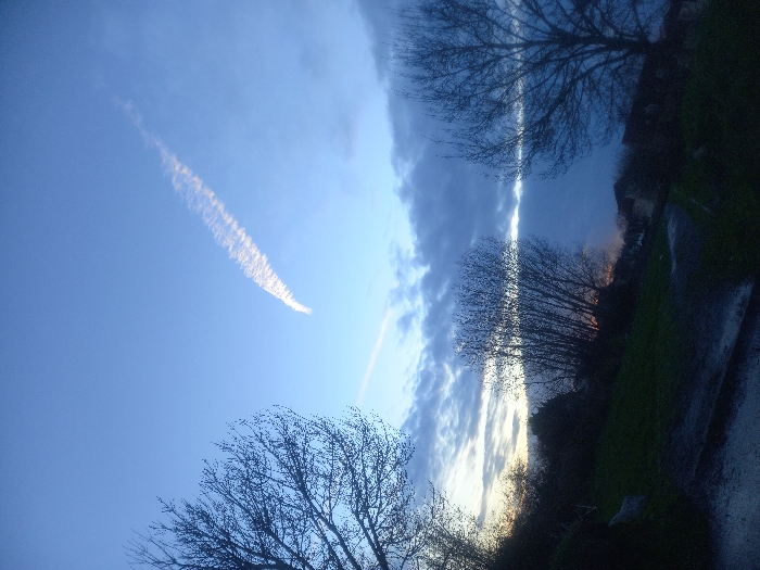 A landscape image features a blue sky with a contrail streaking across it. Bare trees are silhouetted against the sky at the bottom and top of the image. Dark clouds run vertically through the center, punctuated by a bright strip of sunset light. A road or path is visible on the right, bordered by grass and foliage, creating a sense of depth. The angle of the image suggests an upward view.