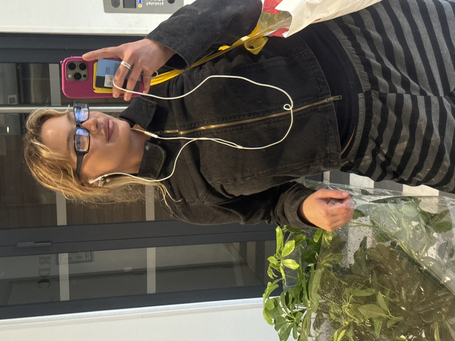 A young adult female is depicted taking a mirror selfie indoors in Nogent-sur-Marne, France. She has blonde hair, wears black rectangular glasses, and white wired earbuds are visible in both ears. She is dressed in a dark, cropped, zippered jacket with a brass-colored zipper and black and grey horizontally striped pants. Her right hand holds a hot pink iPhone, which contains a yellow card visible behind the phone's transparent case, and a silver ring is present on her left ring finger. Her left hand rests on a large green potted plant, wrapped in clear plastic sheeting with visible condensation, situated to her left. In the background, behind her, a dark-framed glass door or window reflects the reversed text "RDC." To the far right, a grey wall panel features a white intercom or control panel. A white shopping bag with yellow ribbon handles hangs from her left side, partially visible. The immediate environment includes a white wall to the left and a tiled or patterned floor.