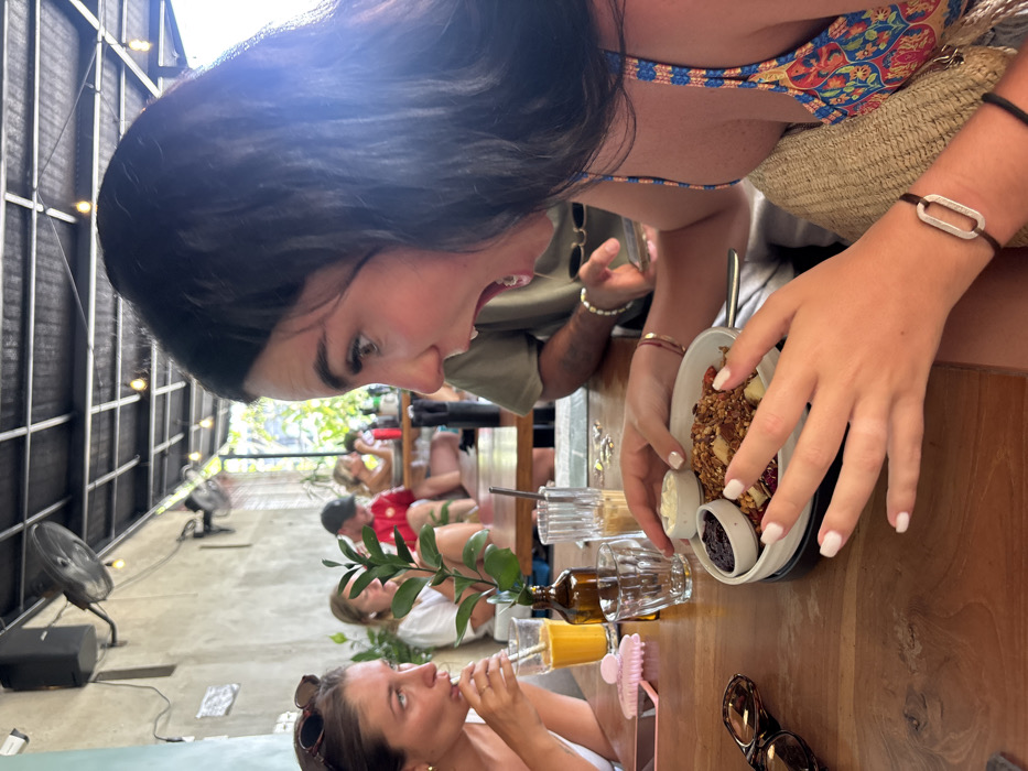 At an outdoor cafe, a woman with dark hair looks excitedly at a plate of granola. A companion sips a yellow drink with a straw. The table is wooden and cluttered with glasses, a small bottle, and sunglasses. In the background, other patrons sit at tables, some wearing red shirts. Fans are placed around the open-air space. A black metal structure forms the ceiling.