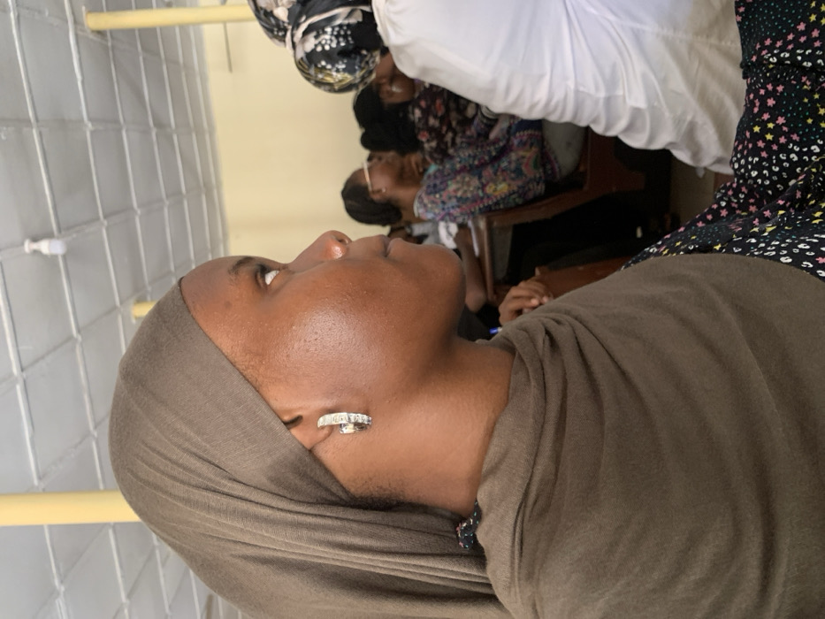 The image depicts an indoor scene within a building in the city of Apata Yakuba, Nigeria, likely a classroom or lecture hall. The foreground is dominated by a young Black female, shown in left-side profile, looking towards the right with a neutral expression and slightly upward gaze. She has smooth, dark skin and wears a plain, loose brown headscarf (hijab) that covers her head and drapes over her left shoulder and chest. Beneath the scarf, a dark garment with small, multi-colored star-like and dot patterns is visible on her shoulder. A silver-toned hoop earring, studded with small clear stones, is worn on her visible left ear. In the midground and background, several other individuals are seated in rows at dark wooden desks and chairs, partially obscured and out of focus. To the immediate right of the main subject, the back of a person wearing a white long-sleeved garment and a dark patterned head covering is visible. Further back, a female individual wearing a multi-colored floral or patterned blouse is seated, as well as another person wearing eyeglasses. The interior environment features light-colored walls, a light-toned grid-patterned ceiling with a single white, cylindrical LED light fixture hanging centrally. At least one yellow support pillar is visible on the right side of the background. The scene is evenly and brightly lit. No direct interactions are apparent; the individuals appear to be passively observing a focal point outside the camera's frame.