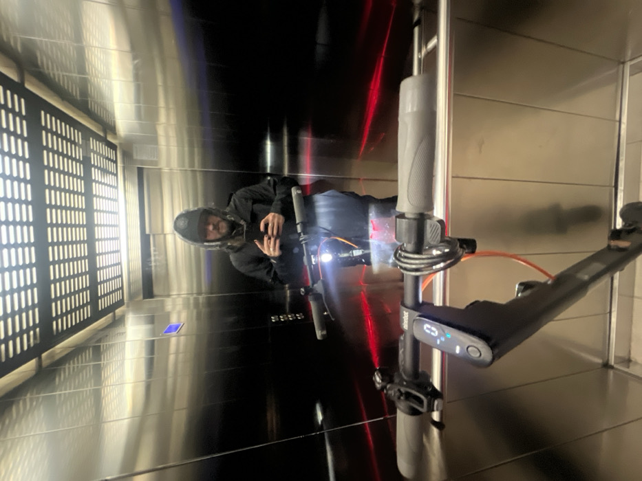 The image displays an interior view of a modern elevator located in a building in Podgorica, Montenegro. The elevator features brushed metallic walls and a grid-patterned ceiling with integrated illumination. Reflected in the elevator's surfaces is a single individual, positioned centrally, wearing a dark hooded jacket and a baseball cap. This individual is holding a dark-colored smartphone with both hands, directed towards the viewer, suggesting they are capturing the image. In the foreground, a black Ninebot electric scooter is prominently displayed. Its handlebars, equipped with grey grips, a central digital display showing "0", and an illuminated front headlight, are clearly visible. An orange coiled cable is connected near the right handlebar. Red light streaks are reflected across the lower portions of the elevator walls and floor. A small blue rectangular panel is also reflected on the upper left wall.