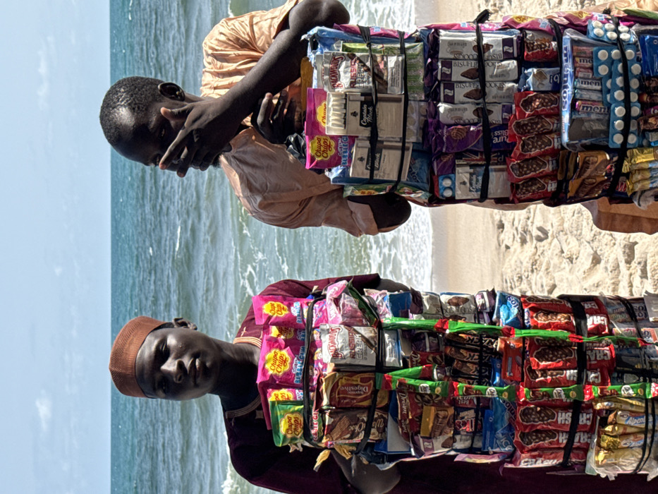 The image displays two young adult males standing on a sandy beach with the ocean visible in the background under a partially cloudy sky. Both individuals are engaged in vending, each carrying a large, vertically stacked display of packaged snack items strapped to their bodies. The individual on the left wears a reddish-brown long-sleeved garment with light embroidery and a matching kufi-style cap. He looks directly forward with a neutral expression. His merchandise display includes multiple rows of packaged "Chupa Chups" lollipops, "Kit Kat" chocolate bars, "Digestive" biscuits, "Russian Cream" biscuits, "Dream" chocolate bars, and "CRUSH" chocolate bars, along with other unidentifiable snack packages, all secured with black straps. Some green and red wrapped items hang vertically from the display. The individual on the right wears a light orange long-sleeved garment. He holds his right hand up, obscuring his mouth and nose, and looks slightly away from the camera. His merchandise display features "Chupa Chups" lollipops, "Backwoods" cigars, "Captain Black" tobacco, "Russian Cream" biscuits, "Biscuits Cookie," "Pure Bliss" snacks, "Melt" chocolates, and "Mentos" candies, similarly secured with black straps. The sandy foreground transitions into the turquoise and dark blue waters of the ocean, where small waves are breaking. The scene is illuminated by natural daylight. This beach setting is located in the city of Mopo Onijebu, Nigeria.