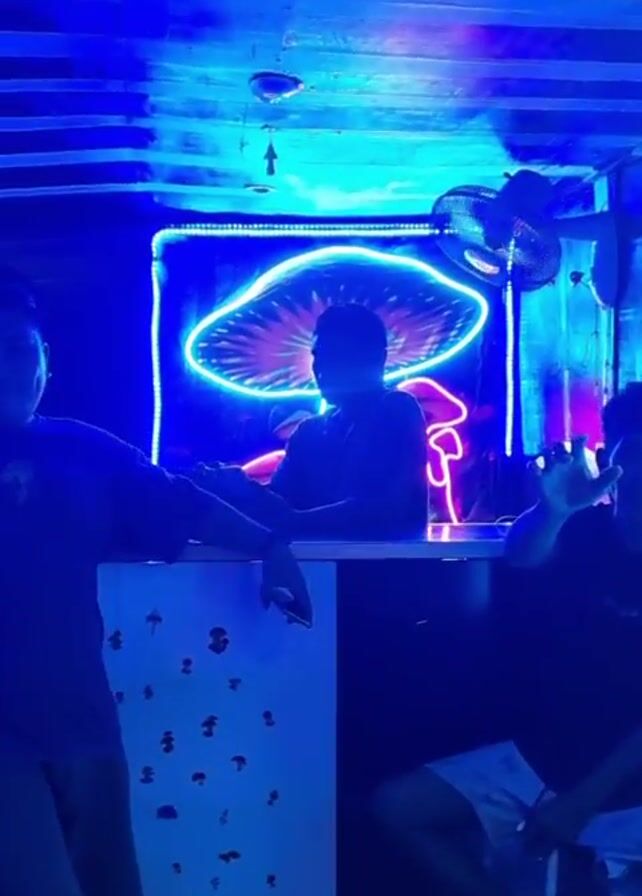 Three men are inside a small, dimly lit space with blue lighting. One man stands behind a counter and the other two are in front of it. One man is standing to the left of the counter and the other is sitting on a stool to the right, waving. There is a lit mushroom sign behind the counter. A fan is visible to the right of the sign. There is a mushroom pattern on the counter. A white shirt is hanging on the right wall.