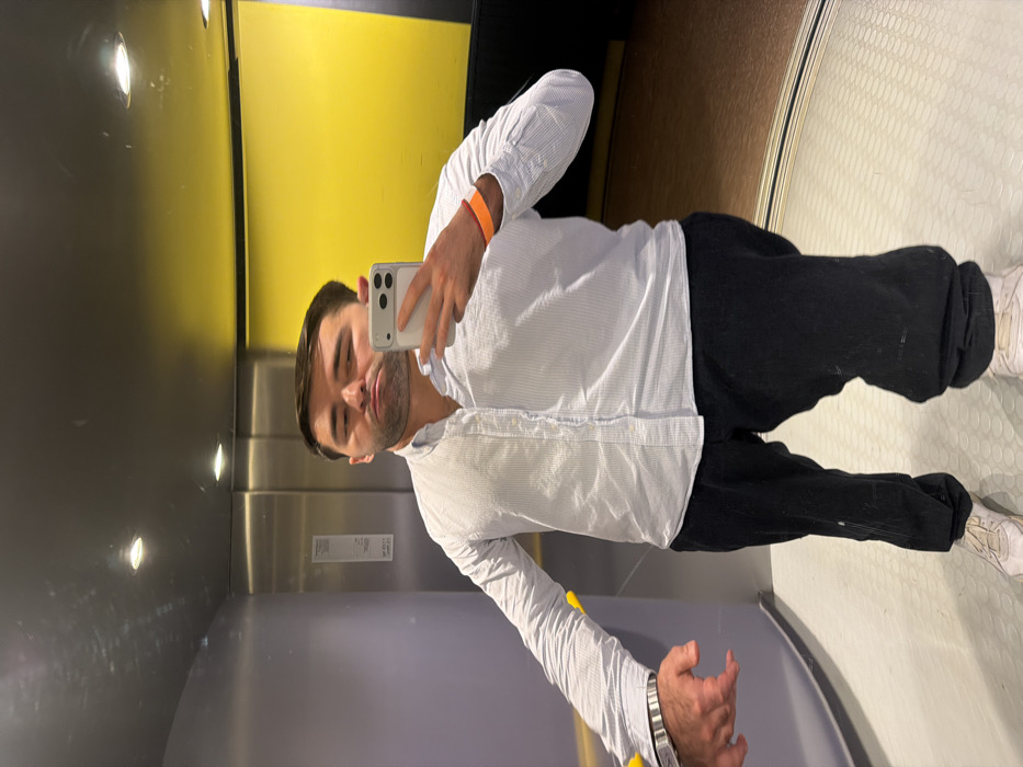 A man takes a selfie in an elevator. He wears a white, long-sleeved shirt, black pants, and white sneakers. An orange wristband is visible on his left wrist. The elevator interior features a yellow wall and a silver control panel. The floor has a textured, circular pattern. He is holding a smartphone to capture the photo.