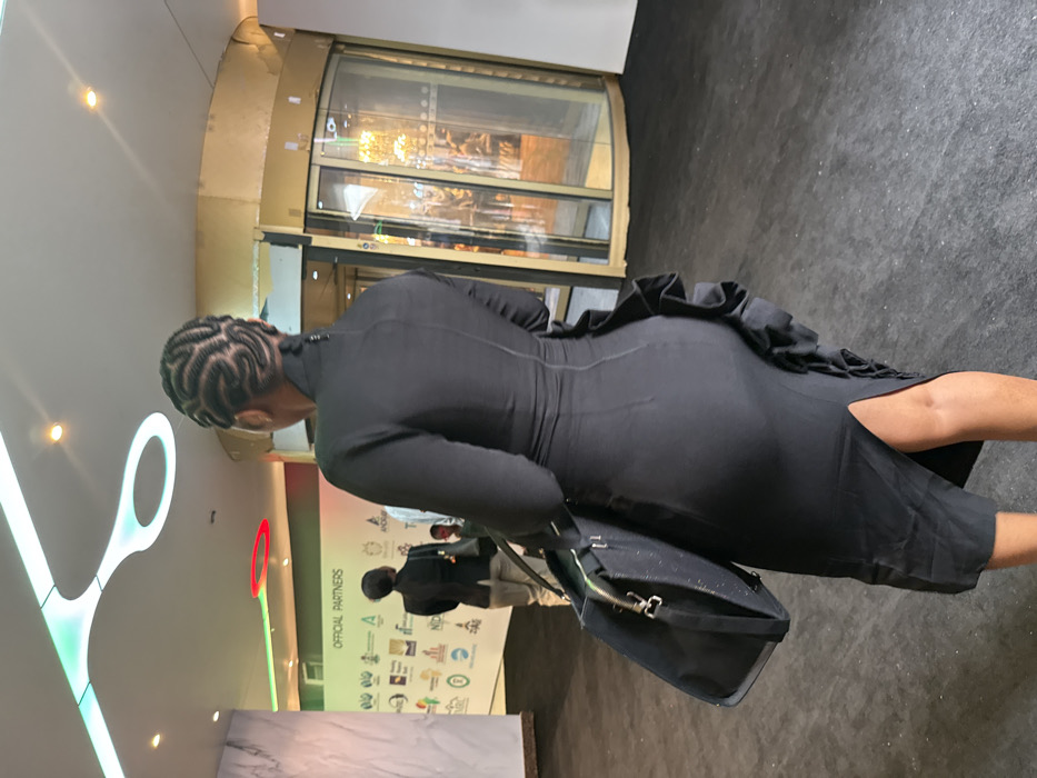 An indoor scene within a modern venue in Itirin, Nigeria, features a female subject in the foreground, viewed from behind, walking towards the left. She wears a form-fitting, long-sleeved black dress with a high collar, intricate vertical ruffles along the left side of the skirt, and a slit exposing her lower right leg. Her hair is styled in tight, wavy braids. She carries a dark, structured handbag with a metallic zipper over her left shoulder. In the background to the left, a white banner displays "OFFICIAL PARTNERS" at the top, followed by multiple corporate logos. Further left, another individual, also seen from behind, wears a dark blazer and light trousers. To the right of the primary subject is a large, golden-framed revolving glass door, through which a chandelier is visible. The ceiling is modern with recessed lighting, including curved green and white LED strips. The floor is dark gray or black carpet.