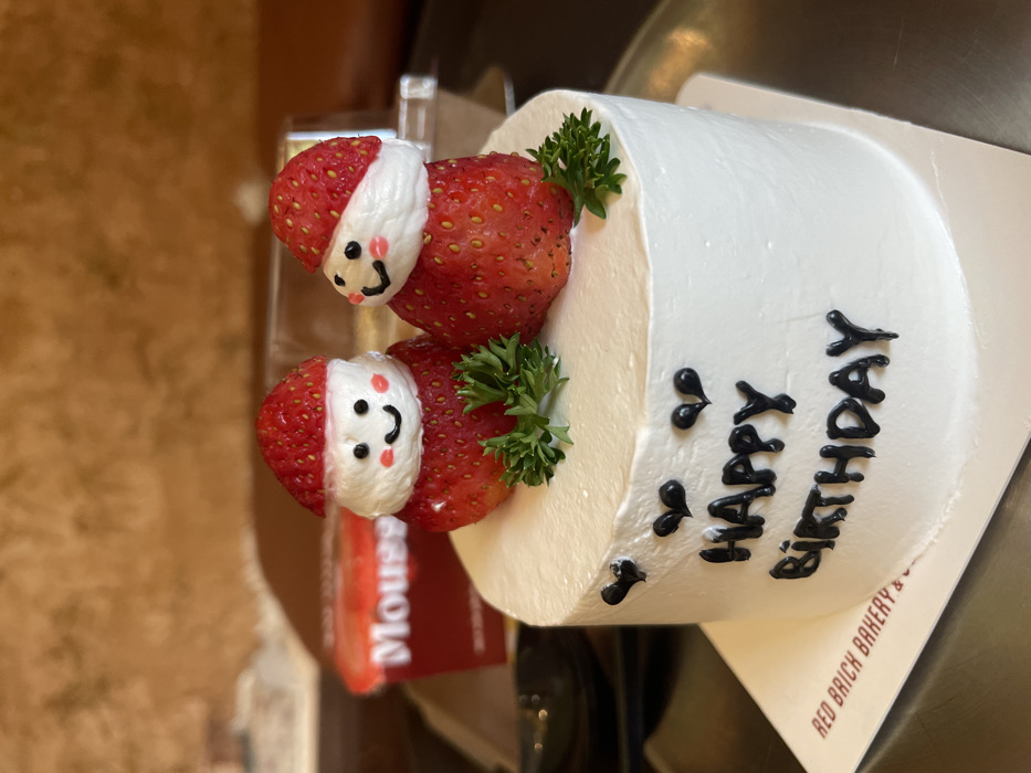 A small, round cake with white frosting is decorated with two strawberries, each topped with white frosting resembling a Santa hat, complete with a drawn-on face. Sprigs of green parsley peek out from behind the strawberries. Black icing spells out "Happy Birthday" on the side of the cake. The cake sits on a white cardboard base with the words "Red Brick Bakery &". A blurry "Mousse" tag in red and white is visible next to the cake.