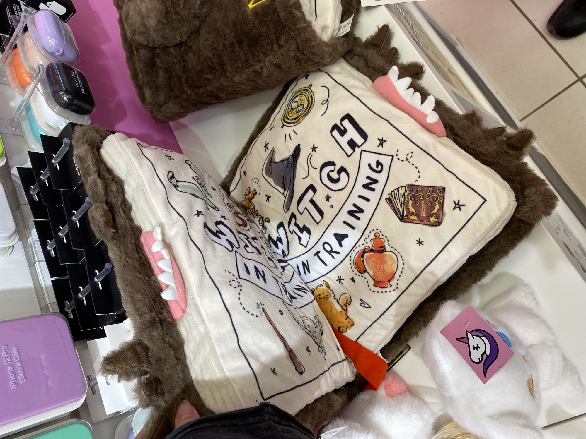 Here is a detailed description of the image: The image shows a display of merchandise, likely in a retail environment. The main focus is on a square-shaped, plush item that resembles a book or a pillow, with text "WITCH IN TRAINING". To the left of the plush item, there are several packaged mobile phone cases in a vertical display, featuring various colors such as purple, light blue, and orange. There is also a black box labeled "For AP Pro2 PROTECTION CASE PODS PRO 2". Another plush item, brown and fluffy, is also visible in the background. The location appears to be an indoor retail space with a white surface underneath the merchandise. I am unable to confirm the city or location of the image.