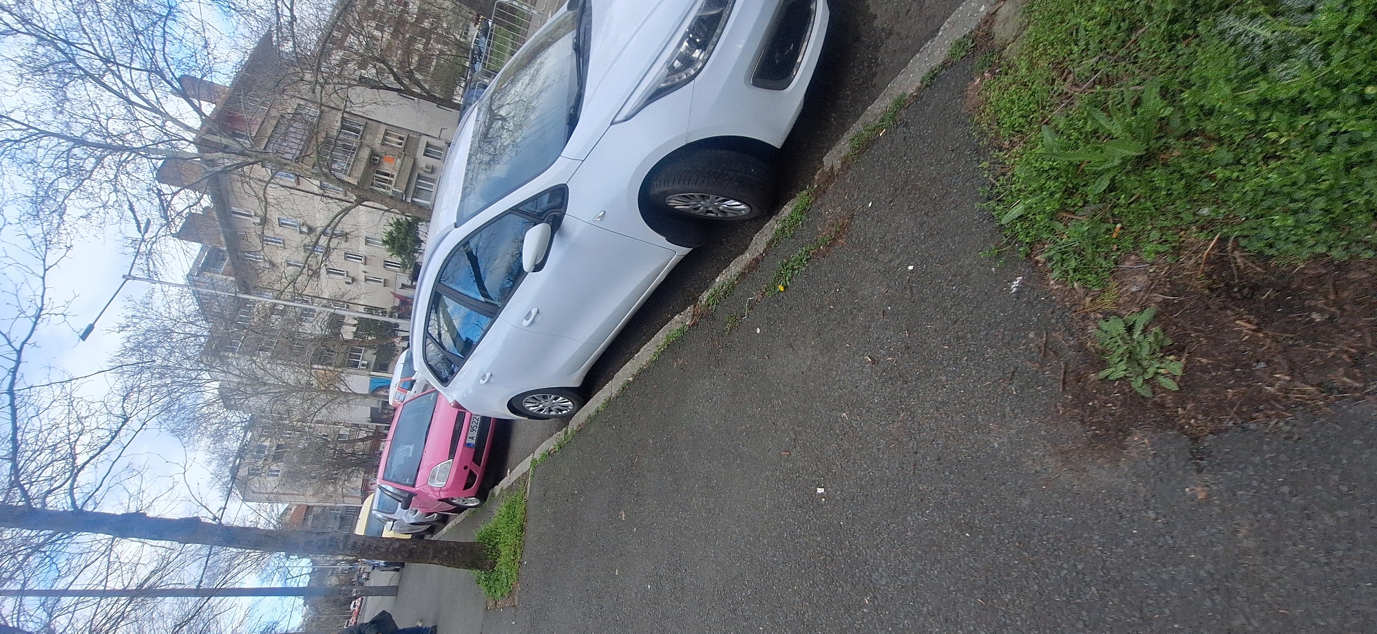 street in what appears to be an urban area of Burgas, Bulgaria, with several cars parked along the roadside. A white car is prominently positioned in the foreground, with a pink car visible behind it. Other vehicles are also parked further down the street. Buildings line the opposite side of the street, and bare trees are visible along the sidewalk. The road surface is paved, and a patch of green vegetation borders the road. The sky is overcast.