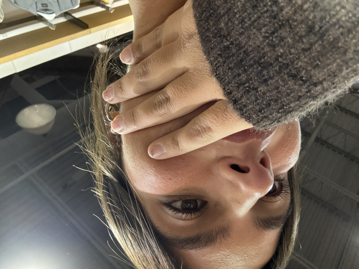 A close-up, upward-angled forensic image captures a young adult individual inside a retail establishment located in Lawrence Township, United States. The subject, exhibiting a medium skin tone, dark hair, and dark eyes, is partially obscured as their right hand covers the lower face, including the mouth and chin. The visible clothing consists of a dark gray textured knitted sweater. A silver hoop earring is present on the right earlobe. Prominent facial features include a visible nose, the right eye, and a portion of the left eye, with lips appearing to have a dark reddish-brown application. The background reveals an industrial-style ceiling with dark corrugated panels and exposed support beams, illuminated by large, white, dome-shaped industrial light fixtures. Below these lights, light-colored shelving units display retail clothing, including a gray collared shirt on a hanger, confirming a commercial interior.
