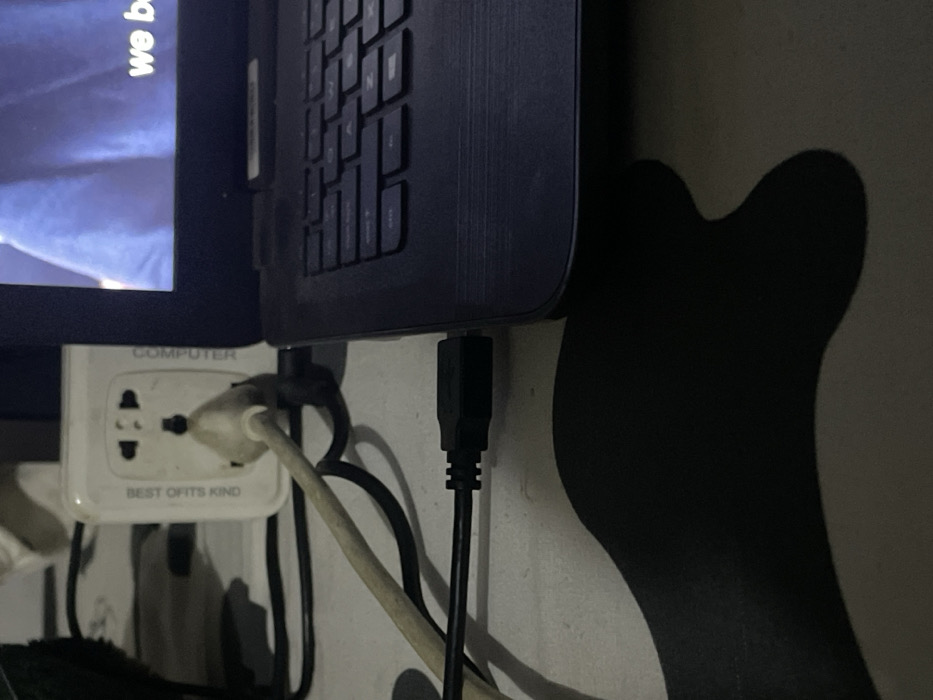 A laptop sits next to a wall, connected to a multi-plug adapter. The adapter, labeled "COMPUTER" and "BEST OF ITS KIND", has a white power plug inserted. A black USB cable is plugged into the side of the laptop, with its cable extending downwards. A dark, abstract shape, potentially a shadow, is visible on the wall next to the laptop. The background is a cream wall.