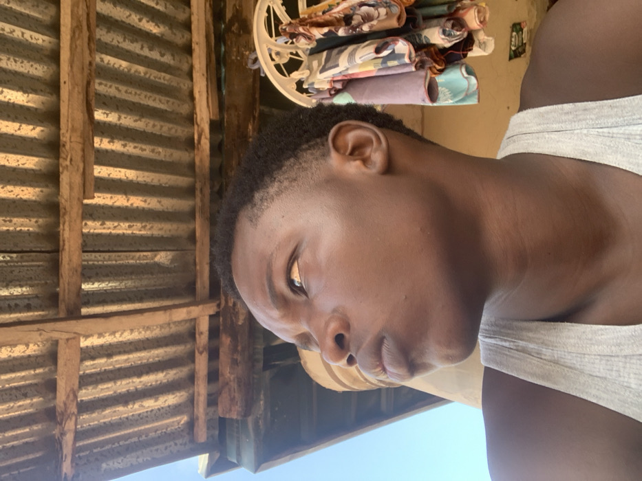 The image, captured in Otuocha, Nigeria, depicts an individual in a close-up profile view, facing left and looking upwards. The individual has dark skin, short dark hair with a faded haircut on the sides, and is wearing a light gray ribbed tank top. Overhead, a corrugated metal roof, supported by rough wooden beams and planks, forms the upper background. To the far left, a section of clear blue sky is visible. To the right and behind the individual's head, a white circular clothes drying rack is suspended, holding several pieces of patterned fabric. A light-colored wall surface is visible behind the drying rack, featuring a small green and white sticker.