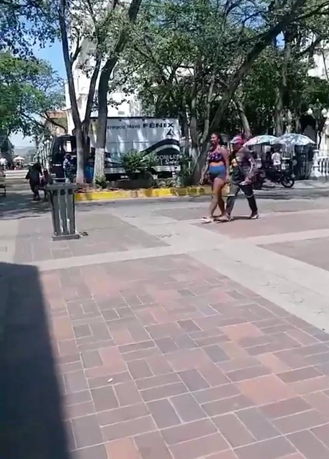 public square or plaza on a sunny day. The square is paved with brickwork and has trees providing shade. A trash can stands near the left edge of the frame. In the background, there are buildings, a food truck labeled "Armatodo Movil FENIX", and vendors with carts. Two people, a woman and a man, are standing in the middle of the square. The woman is wearing a swimsuit and sandals. The man is wearing a hat and darker clothing. They are talking and gesturing. The audio includes music and speech in Spanish.