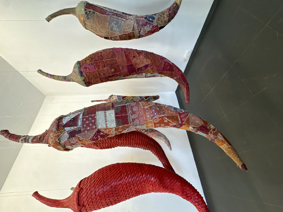 A display features four chili pepper sculptures. Three are crafted from patchwork fabrics in hues of red, brown, and beige. The lowest one is red and appears woven. The sculptures hang at various heights. The backdrop is a white wall on the left and a dark floor on the right.