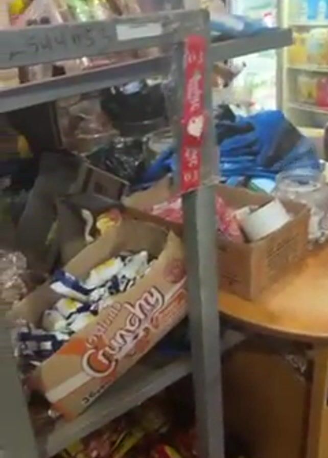 interior of a small store or shop, cluttered with various merchandise. Shelves are packed with snacks, boxes of candy, and other goods. A round table is visible, also covered in items. There is a refrigerator in the background filled with drinks. The camera appears to be hand-held and moves erratically, focusing on the shelves and merchandise.