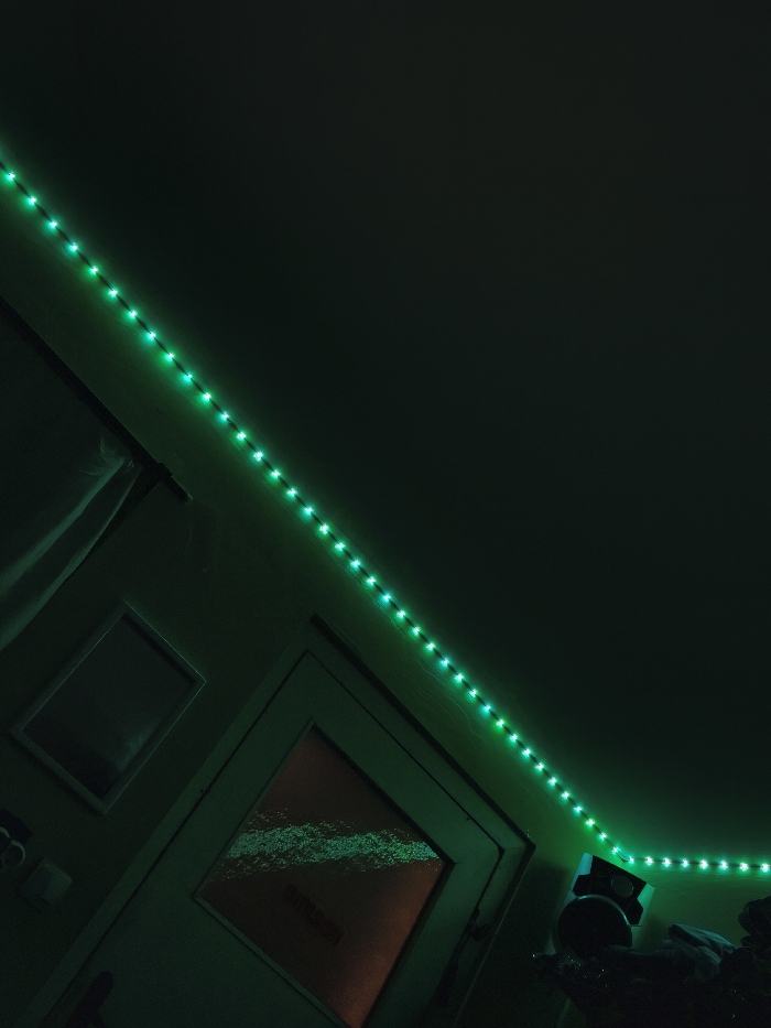 Slavyanovo, Bulgaria. An interior room is depicted, illuminated primarily by a string of green LED strip lights. The LED strip runs diagonally across the upper portion of the image, affixed to a wall or ceiling junction, from the upper left quadrant towards the lower right, then curving upwards. On the left, a light-colored curtain is visible. Below the curtain, a rectangular framed object is mounted on the wall. A closed door occupies the lower central area, featuring a pane in its upper section that reflects green light in a textured pattern. In the bottom right, a dark object resembling a speaker is partially visible. No individuals are present.