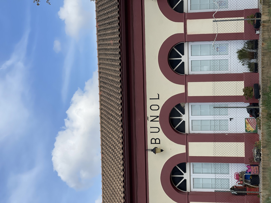 The image depicts the exterior of a building in Buñol, Spain, identified by the prominent black capital letters "BUÑOL" on its facade