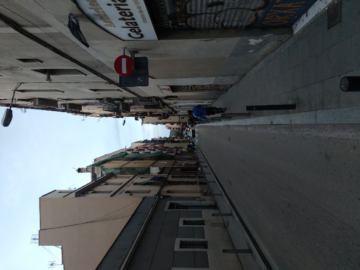 A narrow street winds into the distance between tall buildings. The road surface is asphalt, and pedestrians walk along the right sidewalk. A no-entry sign is visible, and various other street signs and fixtures are present. The sky is visible above the buildings, suggesting an urban environment.
