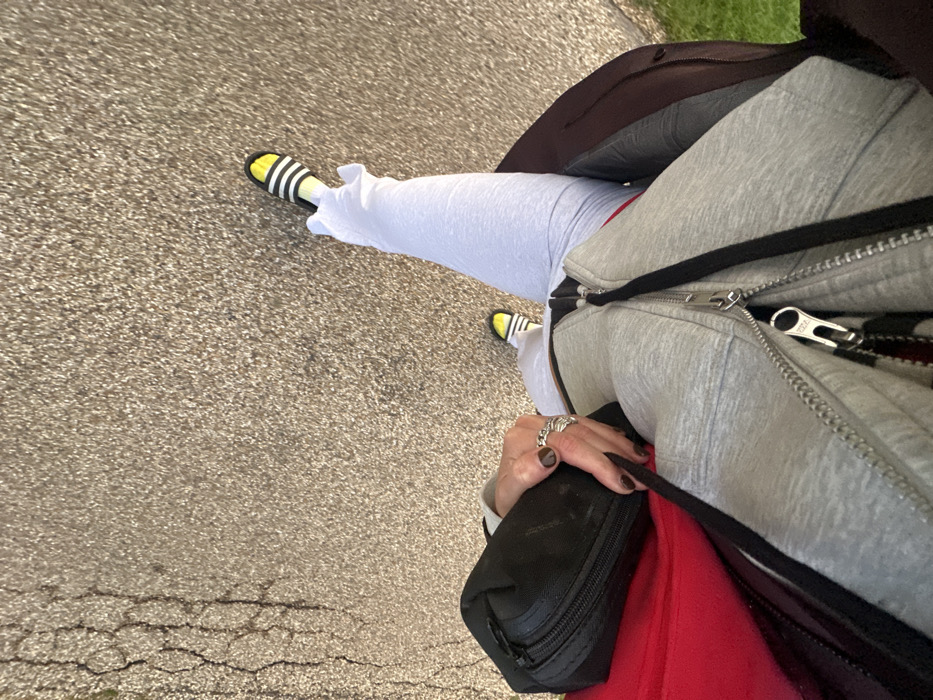 The scene, located in Weymouth, United Kingdom, shows a high-angle, downward view of an individual from the mid-torso to the feet. The person wears a grey zippered hooded jacket, under which a red garment is partially visible. A silver zipper pull marked "YKK" is present on the main zipper of the grey jacket. A black strap, likely from a bag, crosses the upper body. Light grey trousers are worn. On the feet, black and white Adidas slides are worn over bright yellow socks. The right hand, with dark brown nail polish and multiple silver rings on the fingers, grips a small black zippered pouch. The individual stands on a light-colored aggregate paved surface, which shows signs of cracking on the right side. Green grass is visible along the far left edge of the pathway.