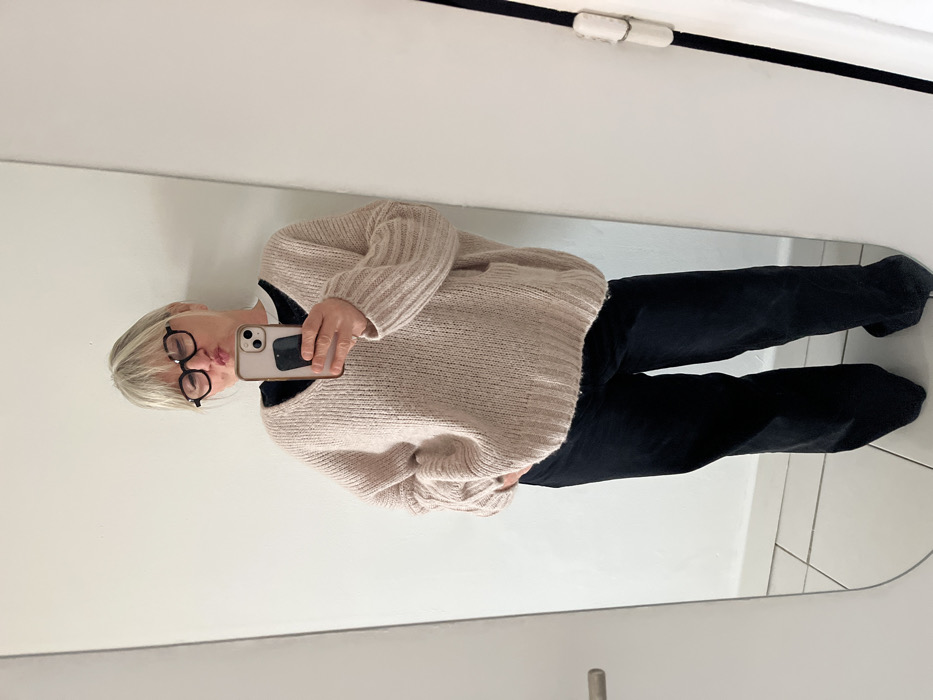 A full-body mirror selfie of a female individual is presented, located in Cannes, France. The subject possesses light-colored hair with bangs and wears dark-framed round glasses, with her lips pursed. She is dressed in an oversized, light beige, ribbed V-neck sweater layered over a dark shirt, which reveals a white collar or trim, and black wide-leg trousers. Her right hand holds a light pink-cased smartphone, equipped with a black rectangular attachment, pointed towards the mirror to capture the reflection. Her left hand is partially obscured, resting near her hip. The reflected environment consists of a plain white wall as the background and a light-tiled floor. To the left of the mirror, a white door with a horizontal brushed metal handle is visible. A white wall section frames the right side of the mirror.