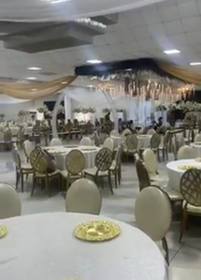 interior of a large, empty event hall, likely set up for a wedding or similar celebration