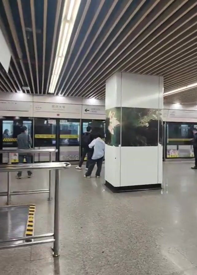 subway station platform. There are several people waiting for a train behind safety barriers. The train doors are closed. There's a white pillar with a nature scene on it in the middle of the platform. The ceiling has parallel linear lights and wood-like panels. The floor is speckled gray. There is an escalator on the left side of the frame.
