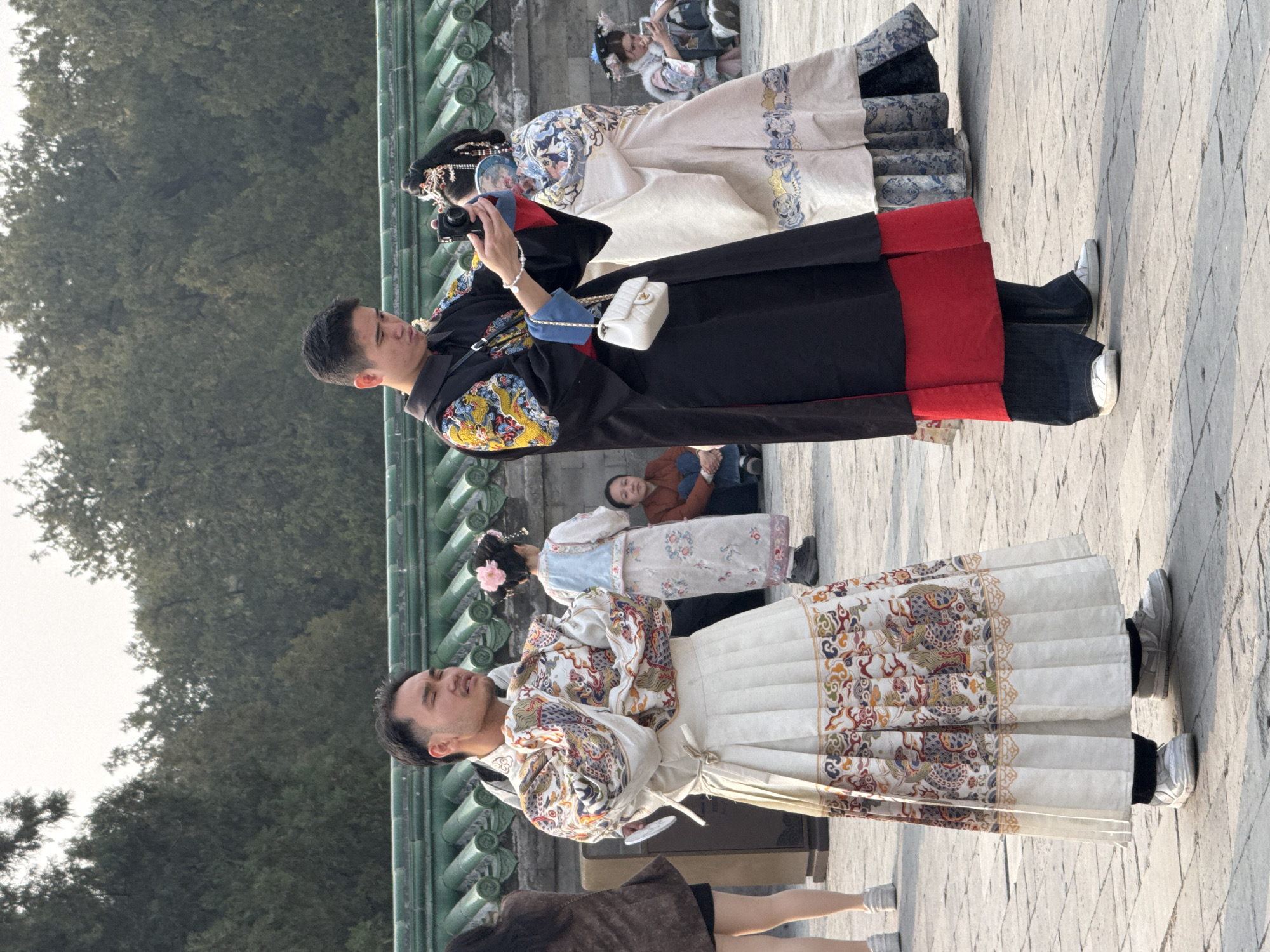 This scene is located within the Temple of Heaven complex in Dongcheng District, Beijing, China. The paved ground, a green tiled roof, and dense conifer trees in the background define the outdoor environment. In the immediate foreground, a male of East Asian descent stands facing left, wearing a white traditional Chinese robe with extensive multicolored patterns, dark pants, and white sneakers. His eyes are partially closed, and he holds a white, fan-like object in his left hand. To his right, another male of East Asian descent wears a long black traditional Chinese robe with vibrant multicolored embroidered sleeves depicting dragons and clouds, a red inner lining, dark pants, and white sneakers. He carries a white quilted crossbody bag on his left shoulder and is holding a black digital camera with both hands, focusing it towards the ornate headpiece of a partially visible female subject. This female, also of East Asian descent, wears a light-colored traditional Chinese robe with patterns and a dark patterned skirt. She faces away from the viewer, towards the camera. In the mid-ground, a female in a brown furry jacket and dark shorts walks away on the left. Further right, a female in traditional light blue and white patterned attire with a pink flower in her hair faces away. Two other individuals are seated on the ground in the background: one female in a reddish-brown top and dark pants, and another female in elaborate traditional costume with a complex headpiece, looking at a smartphone. The green tiled roof of a historical structure is prominently visible in the background, above a gray stone wall.