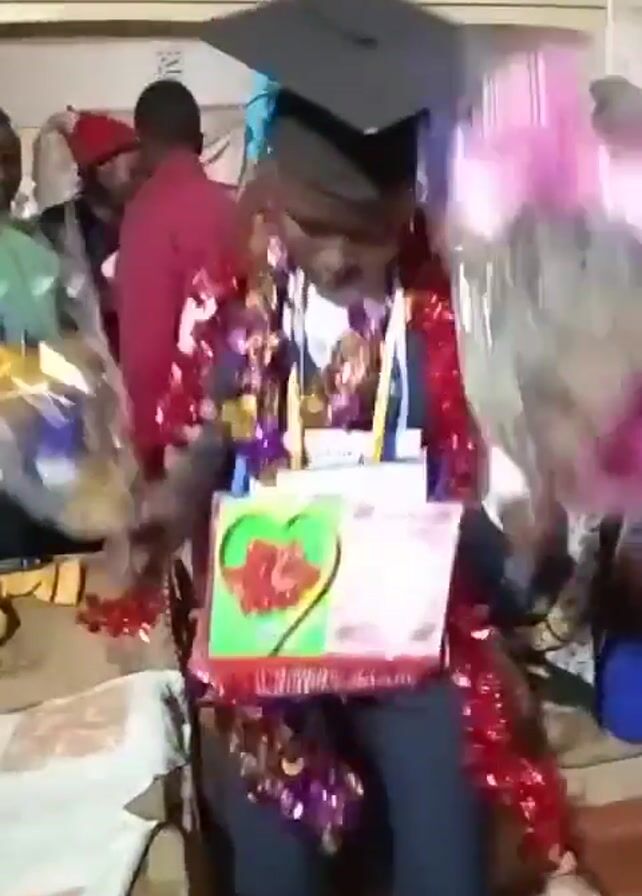 A young person dressed in a white collared shirt and graduation cap stands surrounded by people indoors. They are decorated with leis of red and purple tinsel, and wear a lanyard with a card that appears to read "University of Eldoret". They hold a gift wrapped in a red and white patterned box with a green square shape on the front, and another gift wrapped in pink cellophane. Several people are gathered around, including a person in a red shirt, a person in a green shirt, and someone wearing a blue head covering. There are other gifts scattered on a surface to the left. The lighting is a bit dim. The young person looks at the camera and smiles.