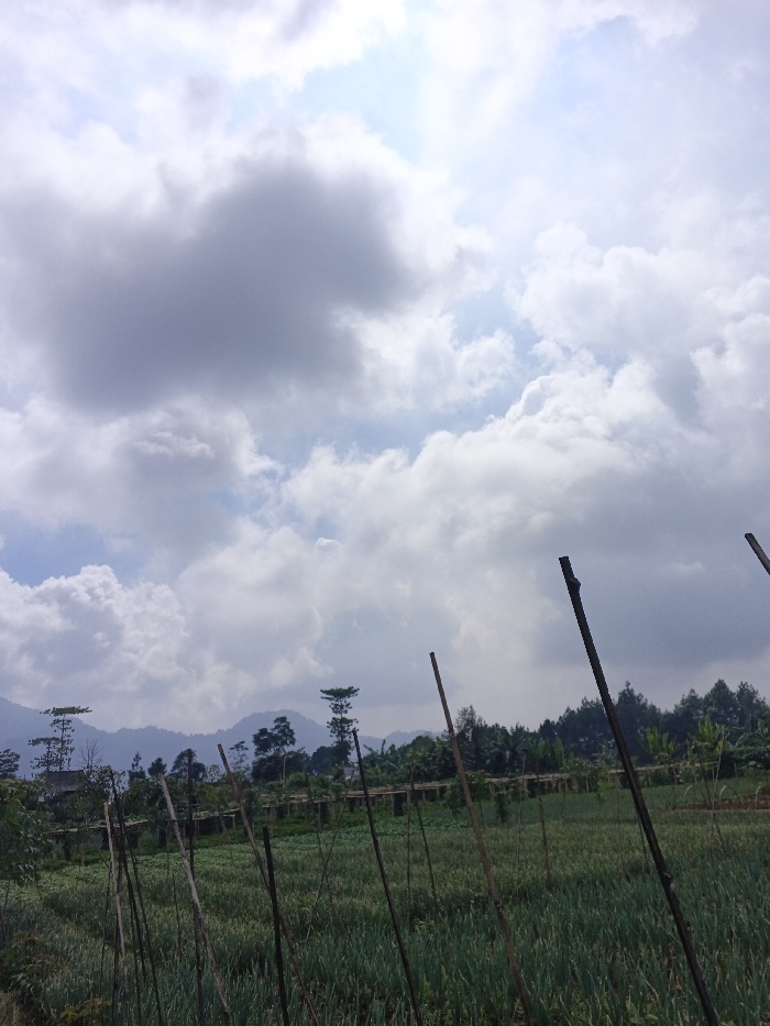 A vast field of green stretches toward a distant line of trees, with mountains fading into the background. Thin, dark poles stand upright in the foreground, punctuating the landscape. Above, a cloudy sky fills the frame, with patches of blue peeking through. The light is diffuse, creating a soft, overcast ambiance.