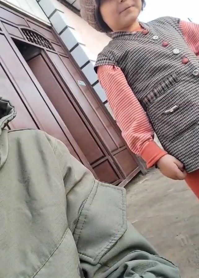 small child, likely a girl, standing outside near what appears to be a building or house with a brown door. She is wearing a brown newsboy cap, a pink and white striped long-sleeve shirt, a brown and grey plaid vest, and orange pants. Another person, whose face is not visible, is wearing a green jacket. At one point, the person in the green jacket reaches out to the girl, possibly to hold her hand or interact with her. The camera angle is low, looking up at the girl. The overall setting seems to be a residential area, possibly a driveway or walkway. The lighting suggests it is daytime.