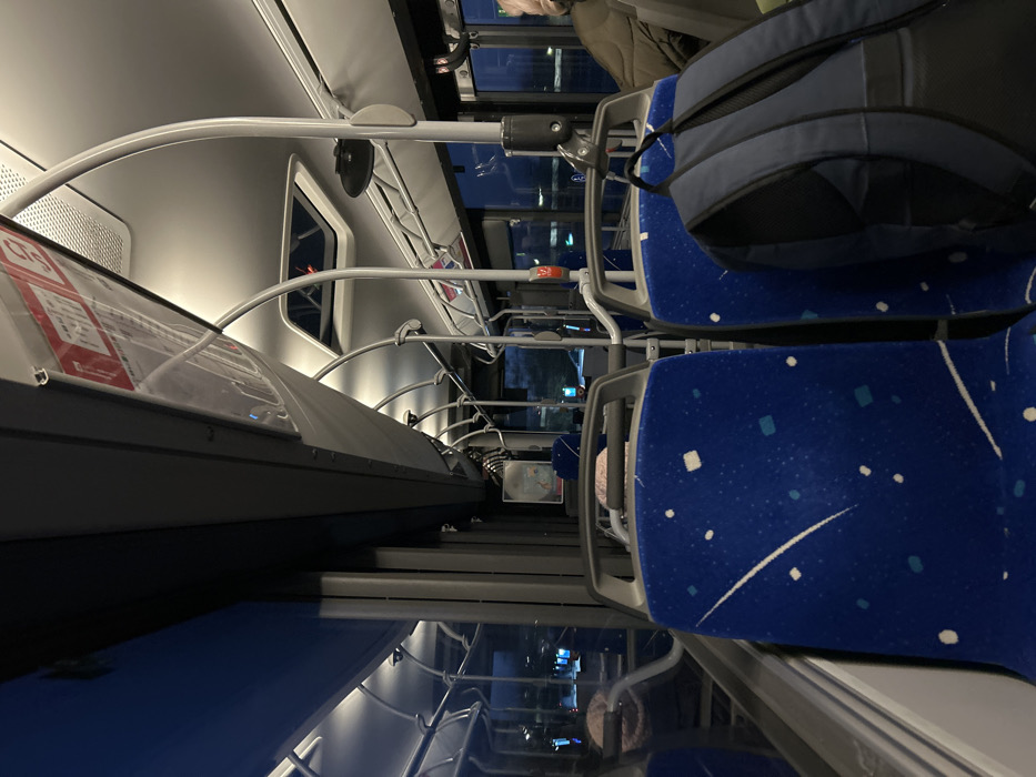 An angled view of a bus interior. Blue, patterned seats line one side, some occupied. A blue backpack rests on one seat. Overhead, curved handrails run along the aisle. Route information is displayed on a panel above the seats. Windows line the opposite wall, revealing a nighttime cityscape. The floor is visible with a blurry reflection of the bus interior.