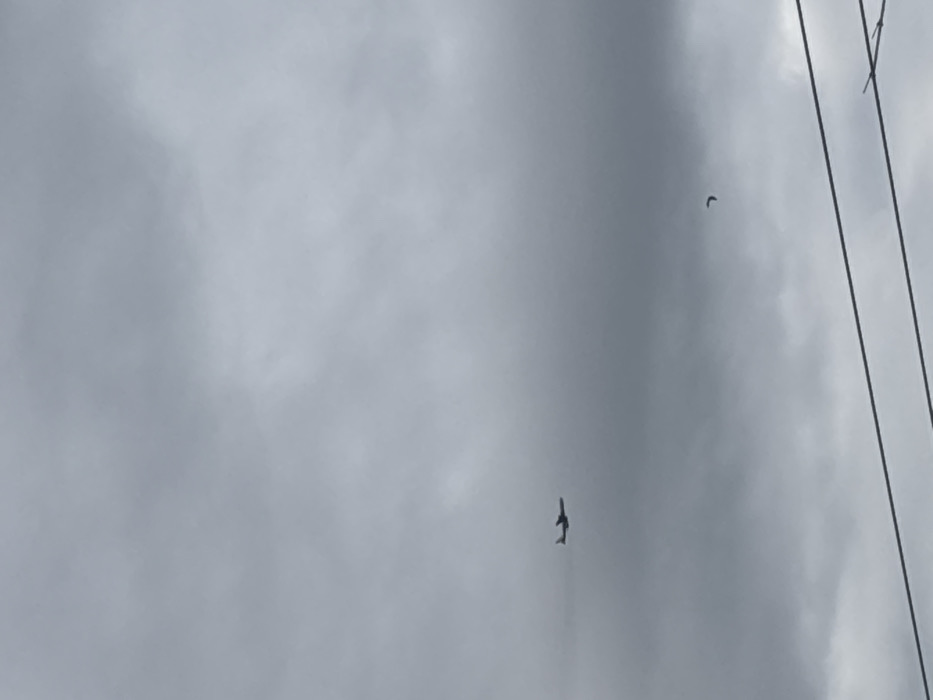 The image displays an overcast sky above Bat Yam, Israel. A dark, twin-engine jet aircraft is observed in the middle-left portion of the frame, flying horizontally from left to right. A faint contrail is visible trailing the aircraft. To the middle-right, a small, dark, crescent-shaped object is present in the sky, below the aircraft's altitude. The lower third of the frame is bisected by two dark, parallel utility lines or cables. The overall environment is characterized by diffuse lighting from thick, gray cloud cover.