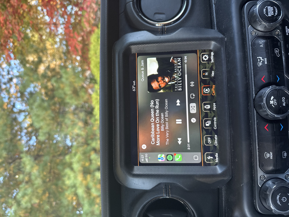 interior dashboard of a vehicle, focused on its central infotainment screen and a portion of the physical controls. The screen displays Apple CarPlay, featuring the song "Caribbean Queen (No More Love On the Run)" by Billy Ocean, from "The Very Best of Billy Ocean." The album art, a close-up of Billy Ocean's smiling face, is visible. The track is paused, with 3:31 elapsed and -0:34 remaining. The current time is 4:27 PM, and a 5G cellular signal is indicated. The external temperature is 63 degrees Fahrenheit. Below the screen, physical control knobs and buttons for audio and climate settings are present. Through the windshield, a blurred outdoor environment is visible, characterized by trees displaying green, red, and orange autumnal foliage against a bright sky. The scene is located in Wellesley, United States.