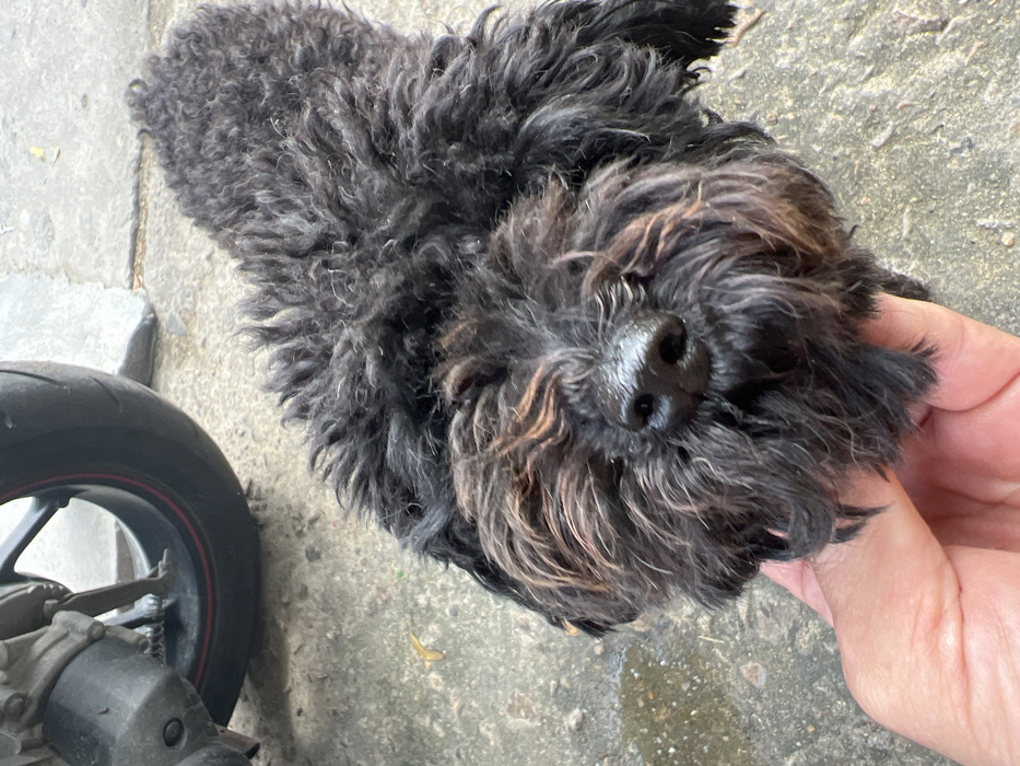 A small, black, curly-haired dog is close to the camera. The dog's face is front and center, with its nose prominently displayed. The dog's head is tilted slightly. A hand is touching the dog near the snout. A motorcycle wheel is visible on the lower left. The background shows an expanse of concrete.