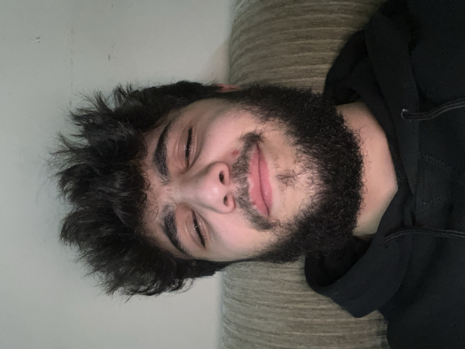 A bearded man with dark, tousled hair lies on a light-colored couch. He appears sleepy or relaxed, with slightly closed eyes and a faint smile. He wears a black hoodie, and the background shows a plain white wall behind him. The image is somewhat dark.