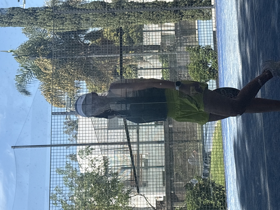 A person is playing a paddle sport on a blue court. They wear a white hat, dark shirt, and bright green shorts. The court is surrounded by a wire fence. Through the fence, buildings and trees are visible. The sky is light blue with some clouds. The photo appears to be taken through a window, possibly a car window, as there is a reflective glare.