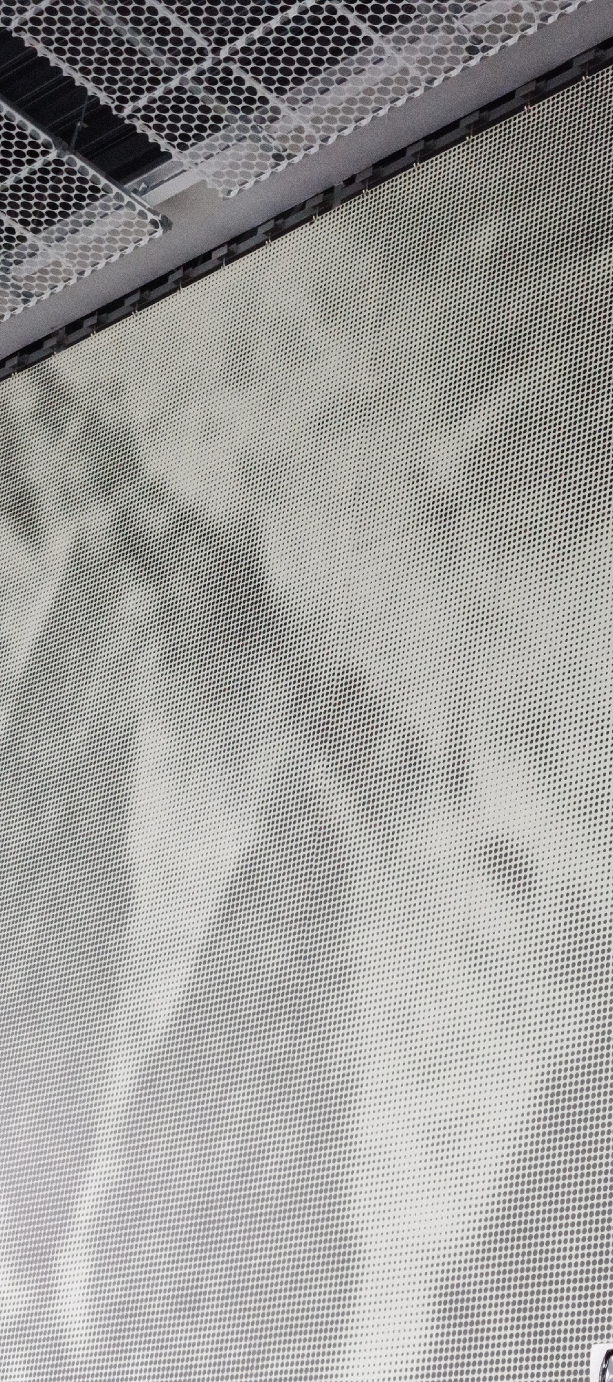 A large, perforated panel display forms the primary subject, extending from the bottom to the top right of the frame