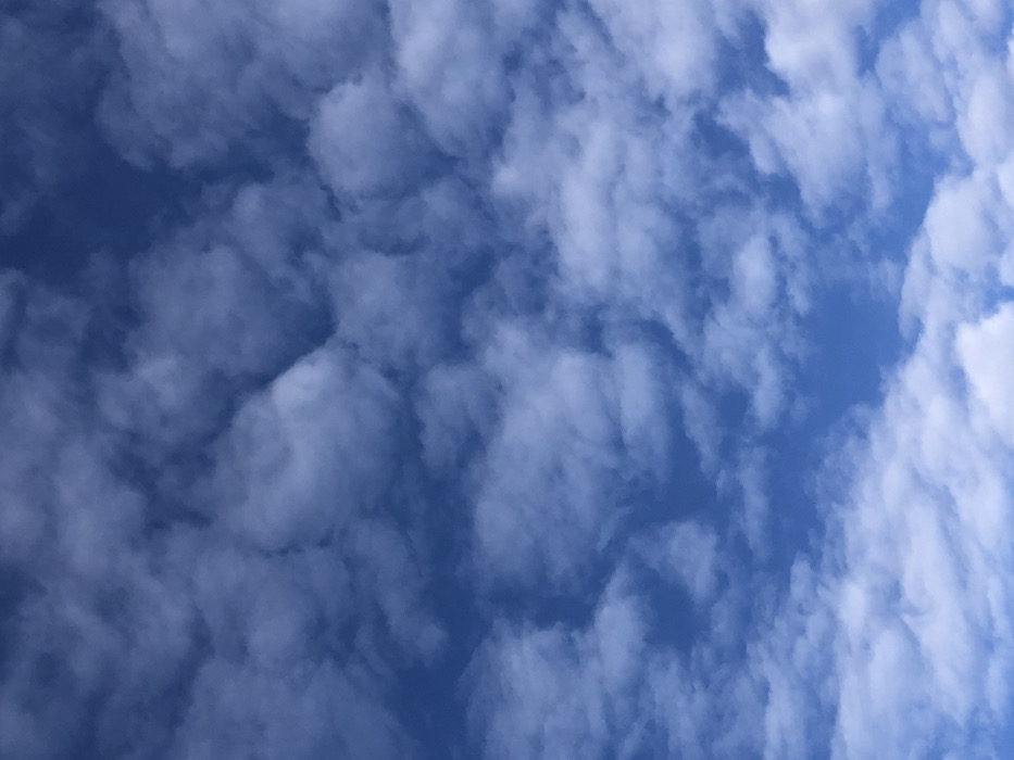 The image displays an overhead view of a daytime sky over Čanj, Montenegro. The scene is dominated by a deep blue sky partially obscured by scattered, predominantly white cumulus clouds of varying sizes and densities. The clouds exhibit soft, rounded forms, with some showing subtle shading, indicating light from an unseen source, likely the sun. Clearer patches of blue sky are visible between the cloud formations, particularly in the upper half of the frame. There are no people, man-made objects, or visible ground features present in the image. The environment is purely atmospheric.