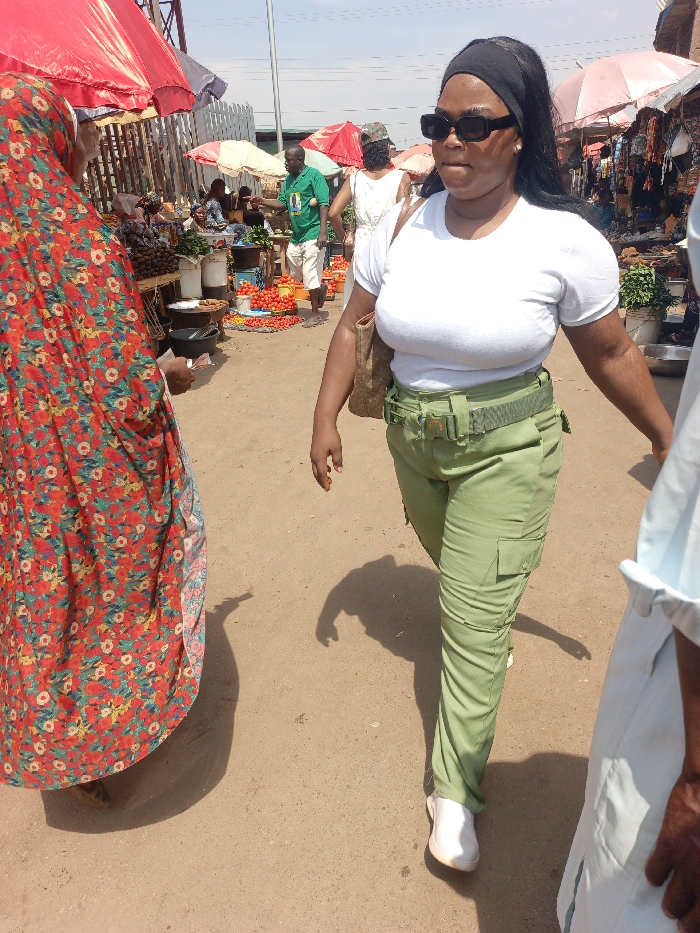 The scene depicts an active open-air market in Akwanga, Nigeria, characterized by unpaved, light brown ground under bright daylight casting strong shadows. In the left foreground, a person is seen from behind, wearing a full-body covering in a red and green floral pattern, holding paper currency. A female subject occupies the central foreground, walking towards the right, wearing a white short-sleeved t-shirt, light green cargo pants with an olive-green belt and buckle, and white shoes. She carries a tan patterned shoulder bag, has dark hair pulled back with a black headband, and wears dark rectangular sunglasses. A partial view of another individual in a light blue garment is visible on the far right. The midground and background reveal numerous market stalls under red and orange umbrellas, displaying produce such as large quantities of red tomatoes and green leafy vegetables. Several people are visible in the background, including a male vendor in a green t-shirt and white shorts standing near a tomato display, indicating ongoing commerce and activity. Overhead wires or structural elements are present against the clear sky.